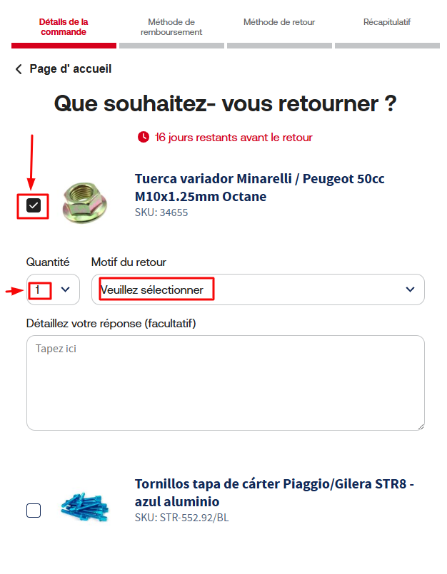 Étape 2: Coche l’article que tu souhaites retourner, indique la quantité et sélectionne le motif du retour dans le menu déroulant.