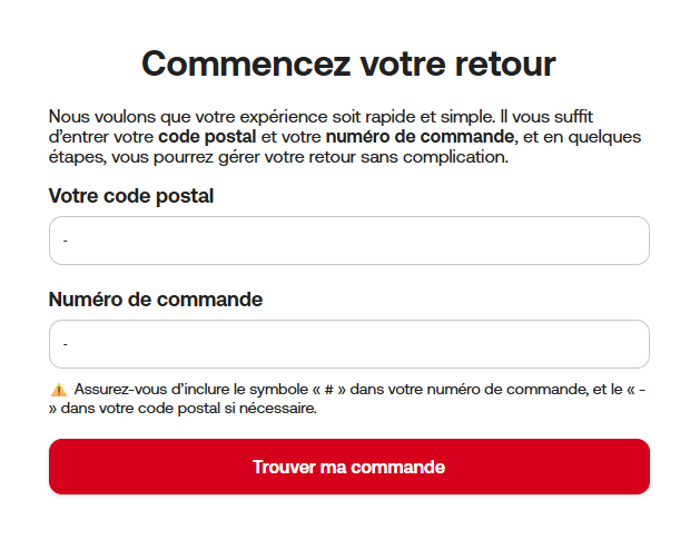 Étape 1: Accède au portail de retours et ajoute le code postal de l’adresse de livraison de ta commande ainsi que le numéro de commande. Assure-toi d’inclure le symbole “#” dans ton numéro de commande et le “-” dans ton code postal si nécessaire.