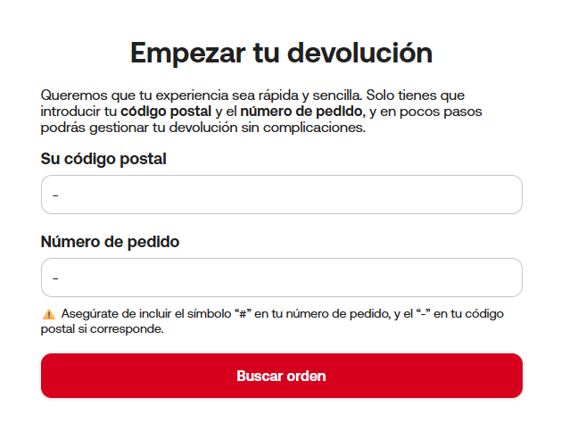 Passo 1: Entra no portal de devoluções e adiciona o Código postal do endereço de entrega da tua encomenda e o número de encomenda. Certifica-te de incluir o símbolo “#” no teu número de encomenda e o “-” no teu código postal, se aplicável.