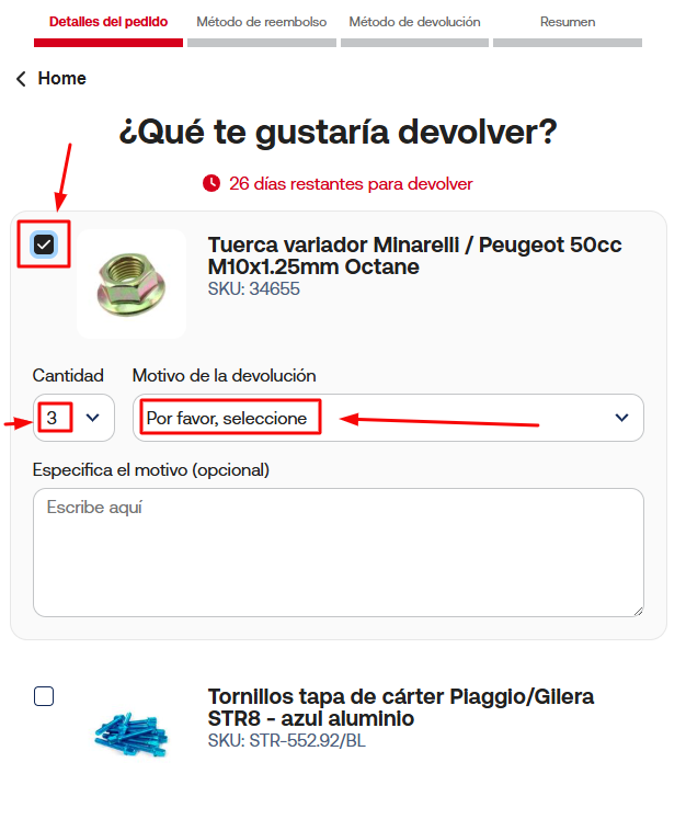 Passo 2: Marca o artigo que desejas devolver, indica a quantidade e seleciona o motivo da devolução no menu pendente.